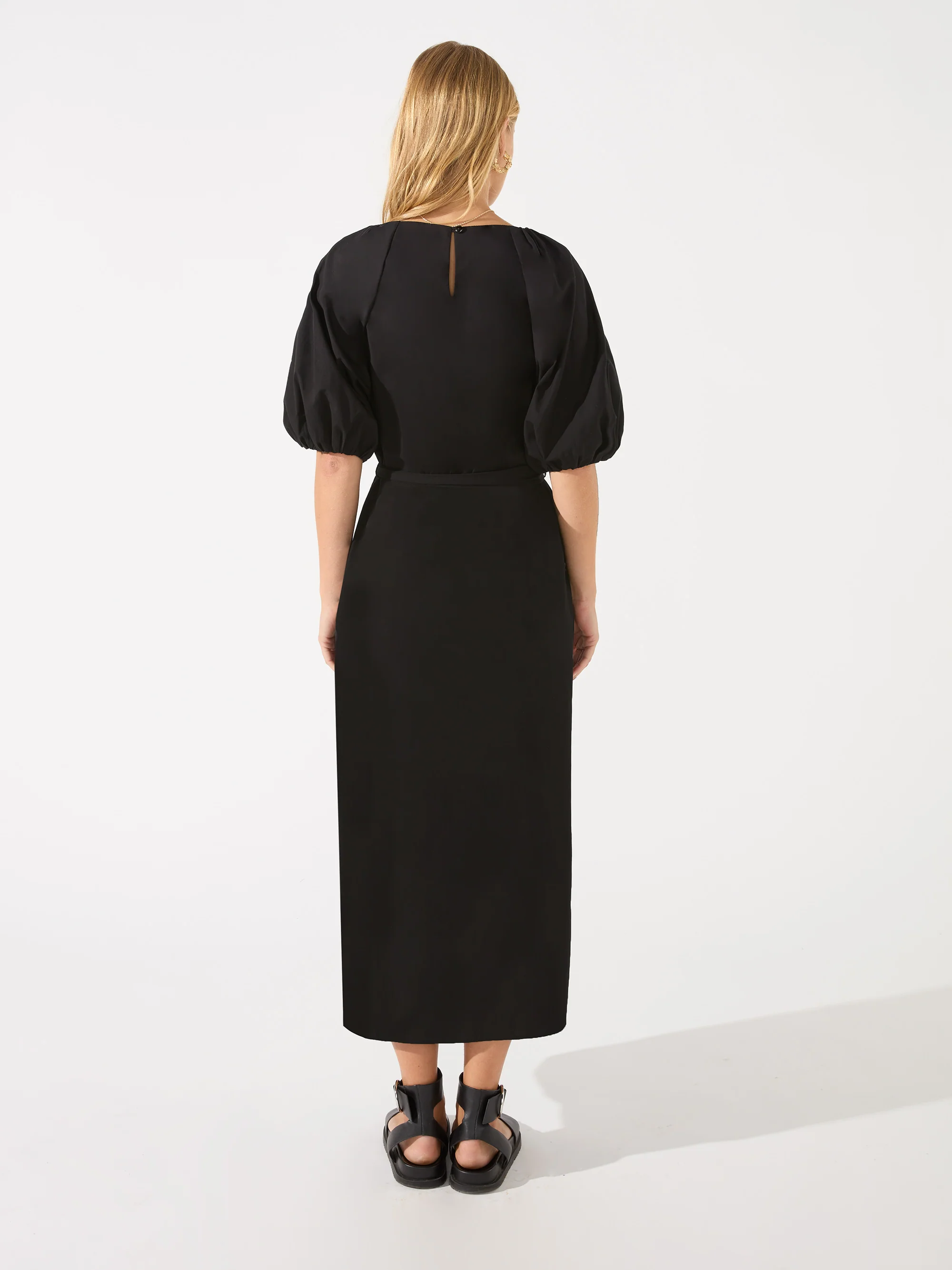 Black Puff Sleeve Tie Waist Sleeve Midi Dress