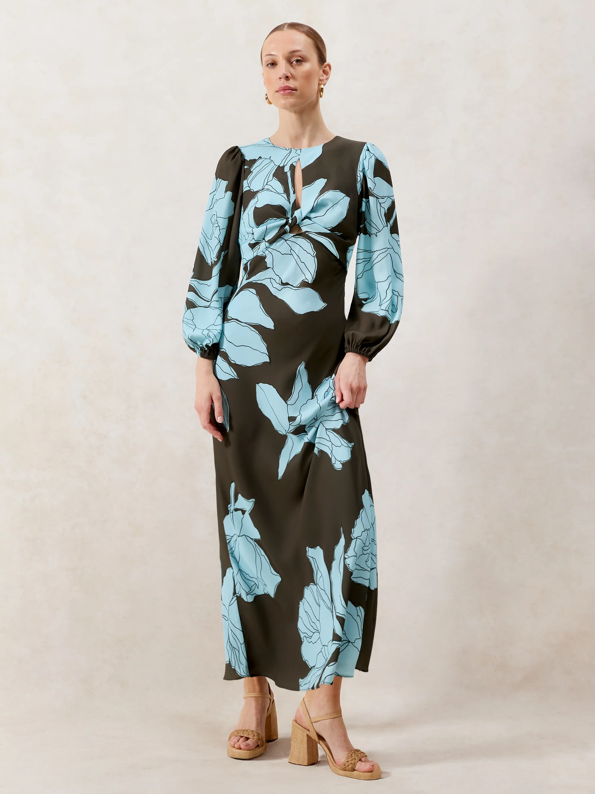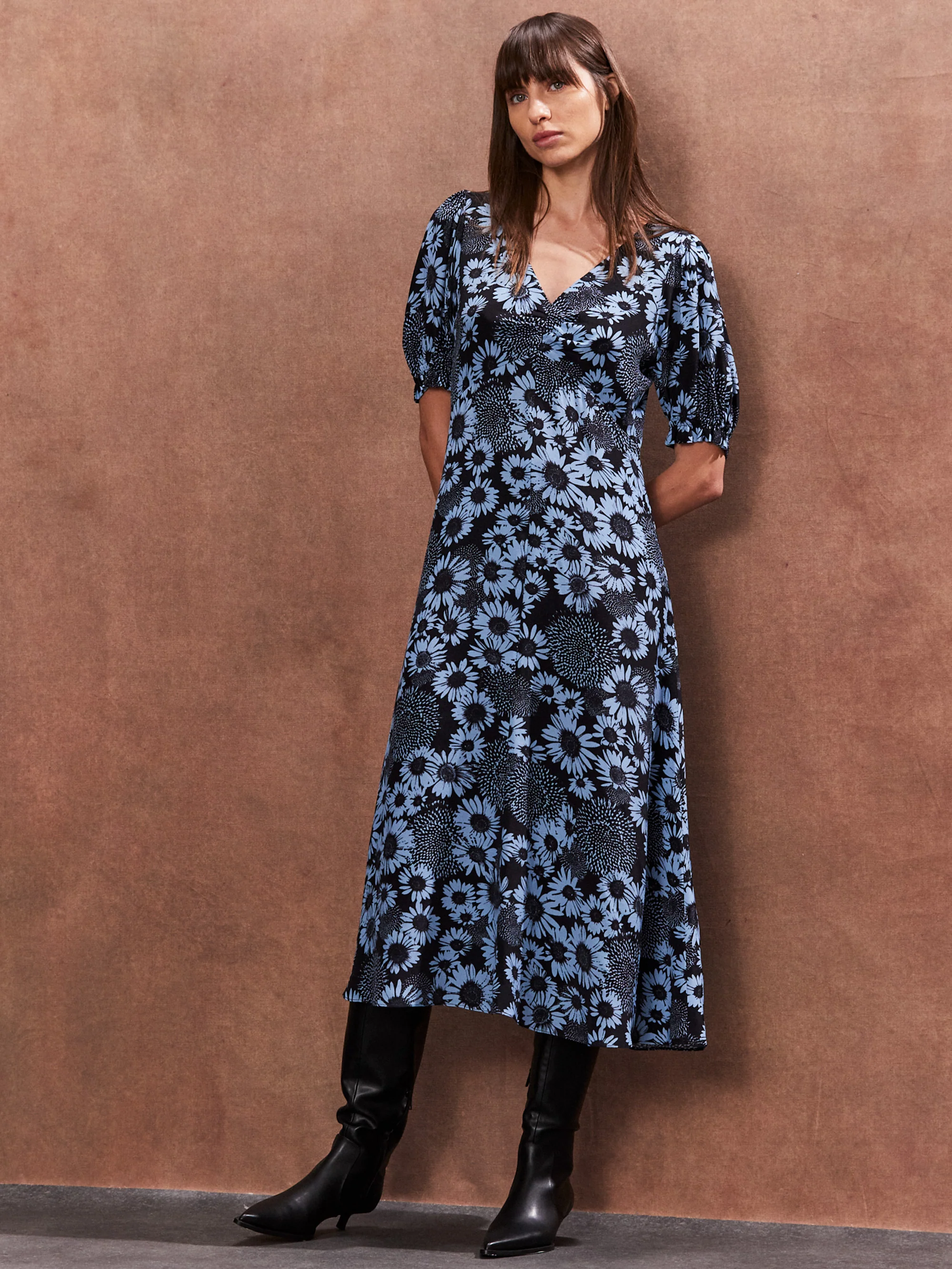 Contrast Ditsy-Print Puff-Sleeve Midi Dress