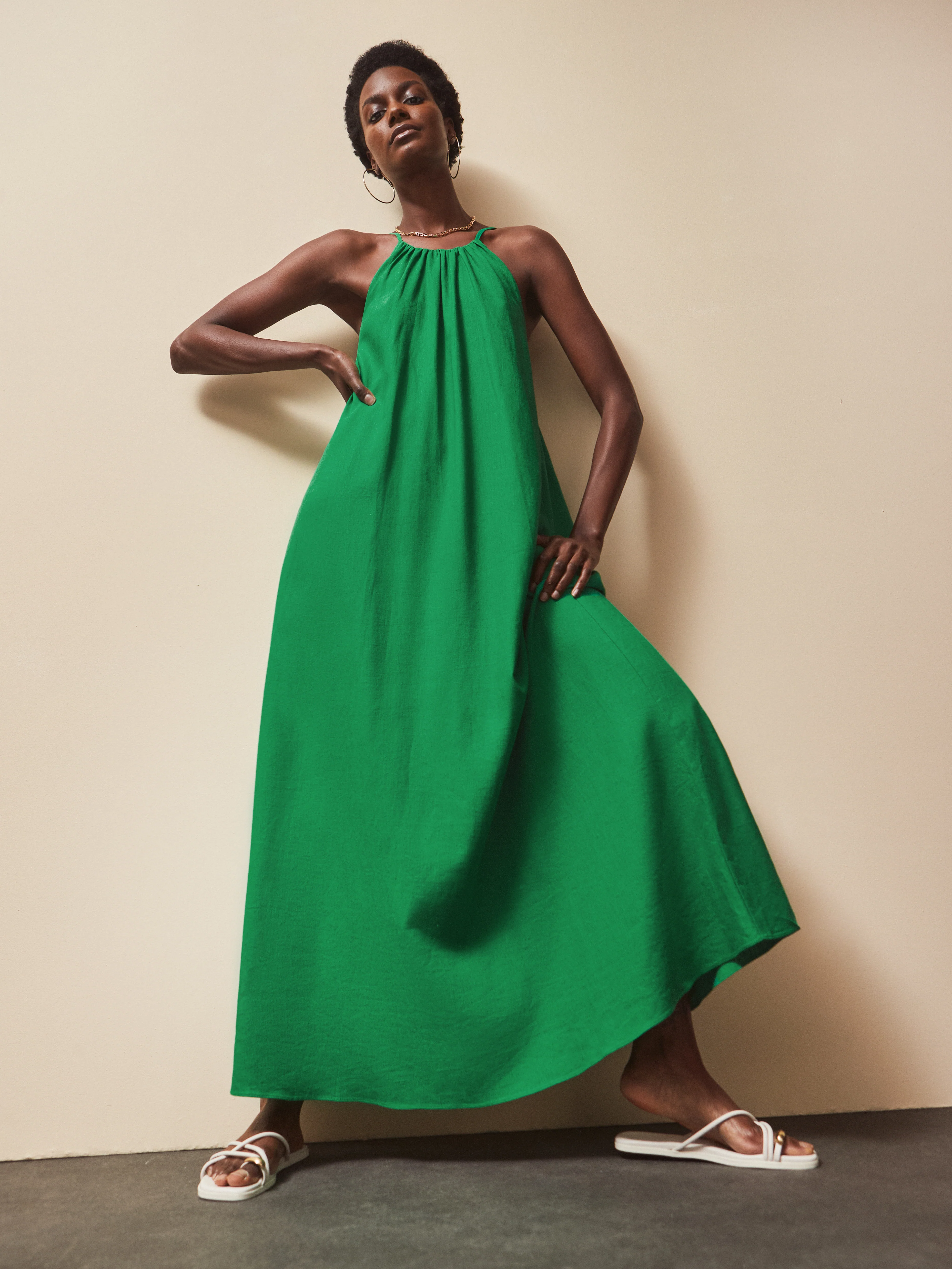 Green Linen Blend Tie Detail Maxi Dress